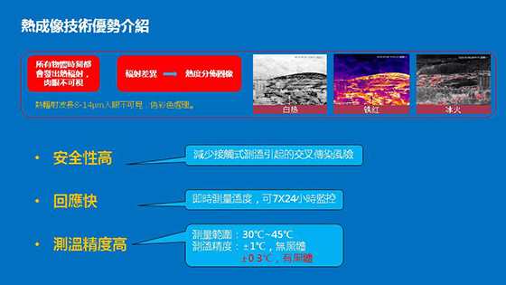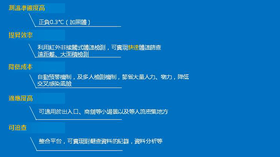 •SF-CT8992紅外線熱成像體溫檢測儀,在機場、學校、醫院、護老院、 健康院, 作為防疫體溫監控設備。紅外線熱像儀體溫檢測儀可檢測到體溫較高 (發燒)者,從而把他們篩選出來, 避免在公眾地方傳播病毒; 而發燒便是H5N1、SARS、MERS、流感的主要徵兆。 SF-CT8992熱成像安裝簡單,即裝即用。操作方面, 在入口處, 多人同時進入快 速溫度檢測,不須停步。數米以上遠距即可測溫,避免近距感染。 SF-CT8992紅外線體溫快速檢測系統,可設定溫度檢測值、體溫超過檢測值,大 螢幕即時顯示紅色於超溫區域(例:人額頭部份)並自動十字游標追蹤。顯示高 溫警告及溫度值 ,並發出警報聲(如裝報警燈)及紅色畫面。操作人可即時對超 溫者作更詳細體溫檢查。 SF-CT8992熱成像儀高性價比高、經多年及超過20家學校實際仗使用驗證, 操作簡便, 可同時通過PC或TV螢幕直接使用。 一般使用埸所: -學校, 包括:幼稚園, 中小學。 -醫院、護老院及健康院。 -MTR地鐵站、高鐵站。 -機場、出入境口岸。